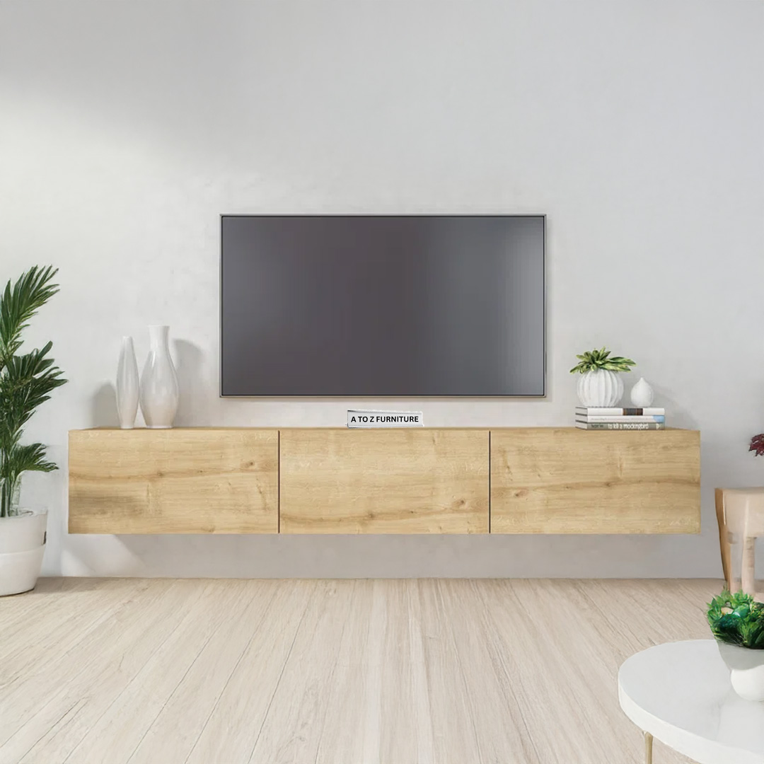 Elevate your entertainment area with the UrbanEdge Wall-Mount TV Unit, exclusively by A to Z Furniture. With its sleek, contemporary design and rustic grey concrete finish, this floating TV unit adds modern elegance to any living space. Designed to accommodate TVs up to 80 inches, it offers both aesthetic appeal and practical storage. The three drop-down cabinet doors open to reveal ample space for your media devices, accessories, or decorative items, keeping your space organized and clutter-free.