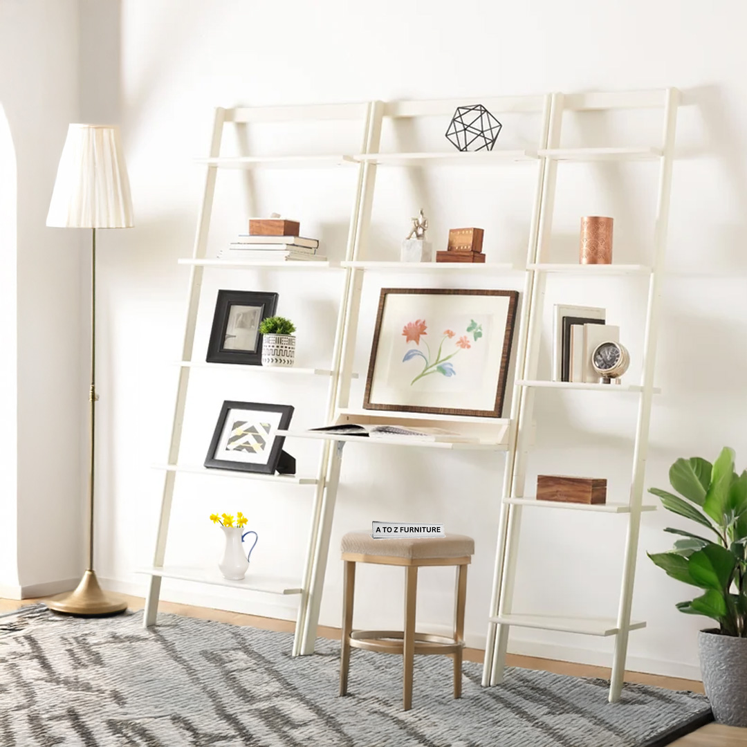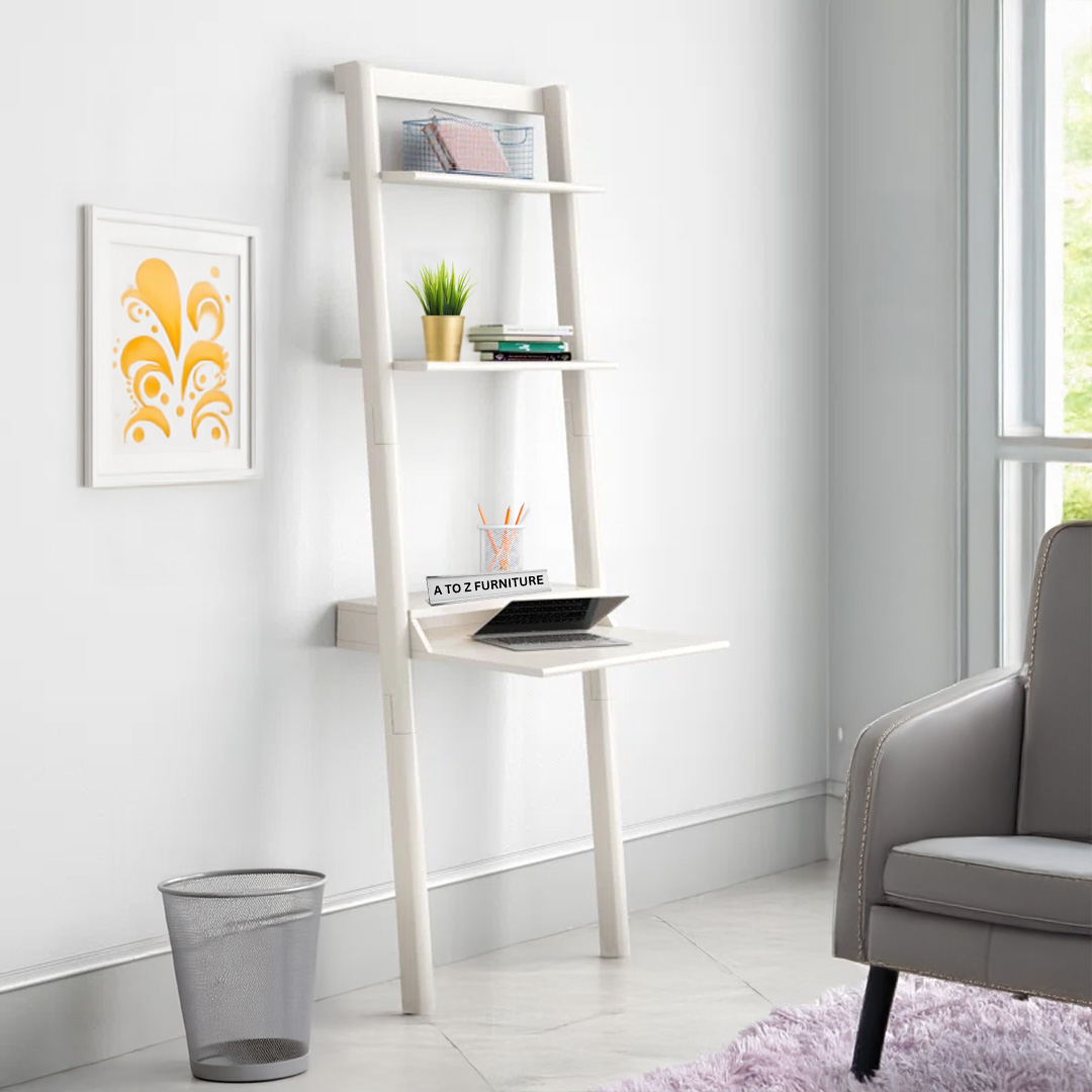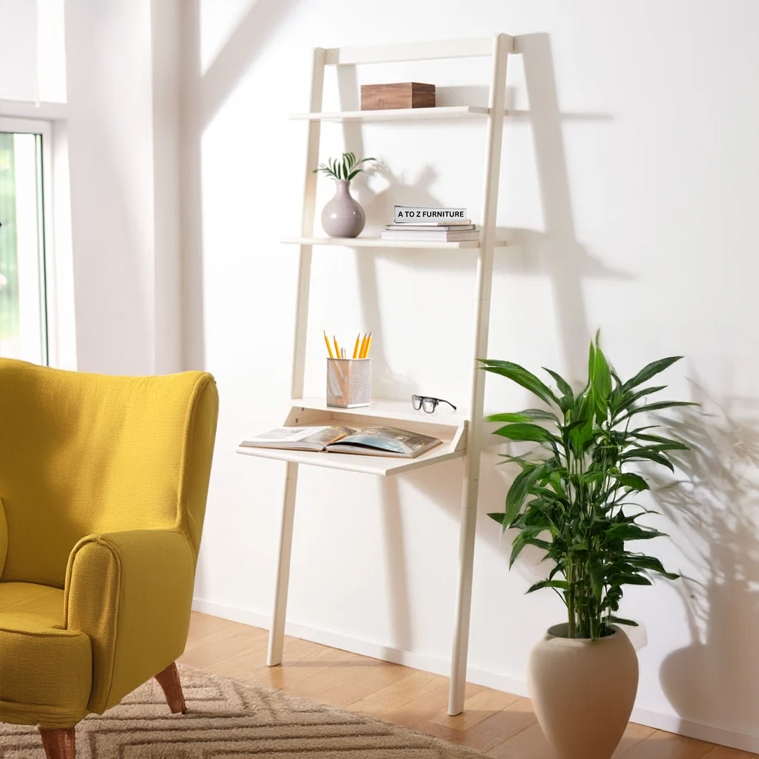 Transform compact corners into streamlined workstations with the Atlas Leaning Ladder Desk. Standing tall yet sleek, this elegant ladder-style unit in a crisp white finish adds vertical storage without consuming valuable floor space. With an integrated desktop and dual upper shelves, it’s ideal for laptops, décor, books, and home office essentials—all in one stylish, space-saving package. Designed specifically for modern UAE interiors, it supports robust work or study needs while maintaining a refined aesthetic.