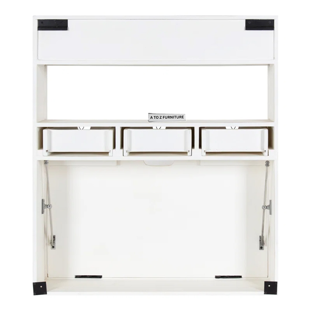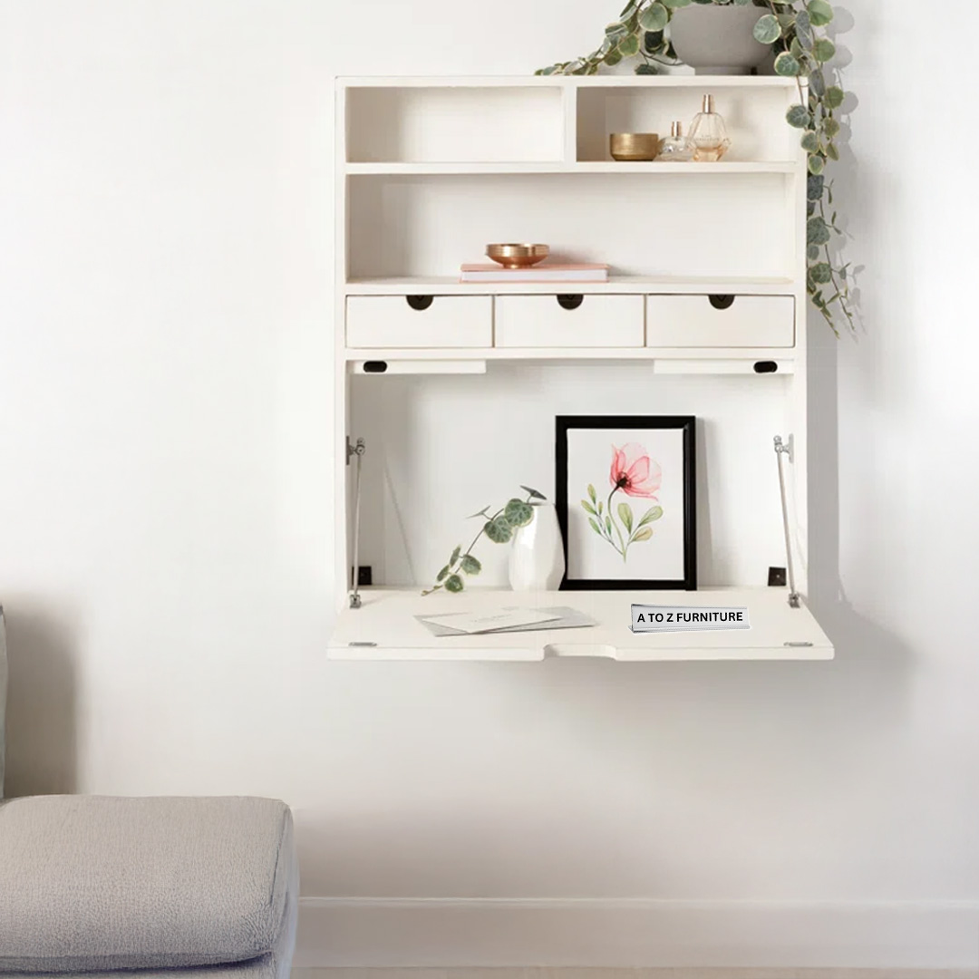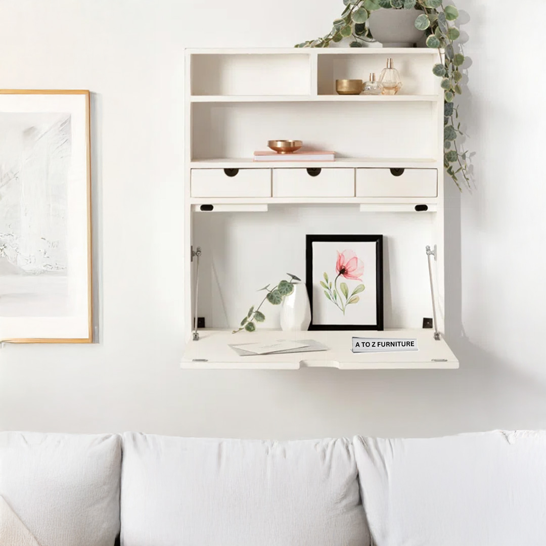 Introducing the Terra Fold Wall Desk, the perfect space-saving solution for stylish and efficient small-space living in the UAE. Crafted from premium MDF Melamine/Laminated Sheet, this foldable wall-mounted workstation combines form and function. It features a spacious drop-down desktop, three front-access drawers, and upper cubbies for storage or décor — making it ideal for compact work nooks, reading corners, or even entryways.