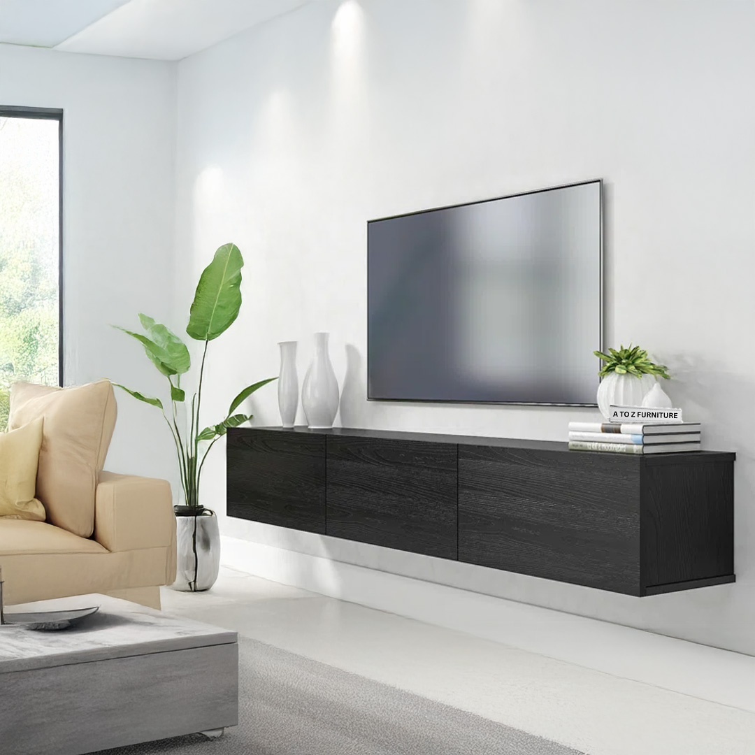 Elevate your entertainment area with the Urban Edge Wall-Mount TV Unit, exclusively by A to Z Furniture. With its sleek, contemporary design and rustic grey concrete finish, this floating TV unit adds modern elegance to any living space. Designed to accommodate TVs up to 80 inches, it offers both aesthetic appeal and practical storage. The three drop-down cabinet doors open to reveal ample space for your media devices, accessories, or decorative items, keeping your space organized and clutter-free.