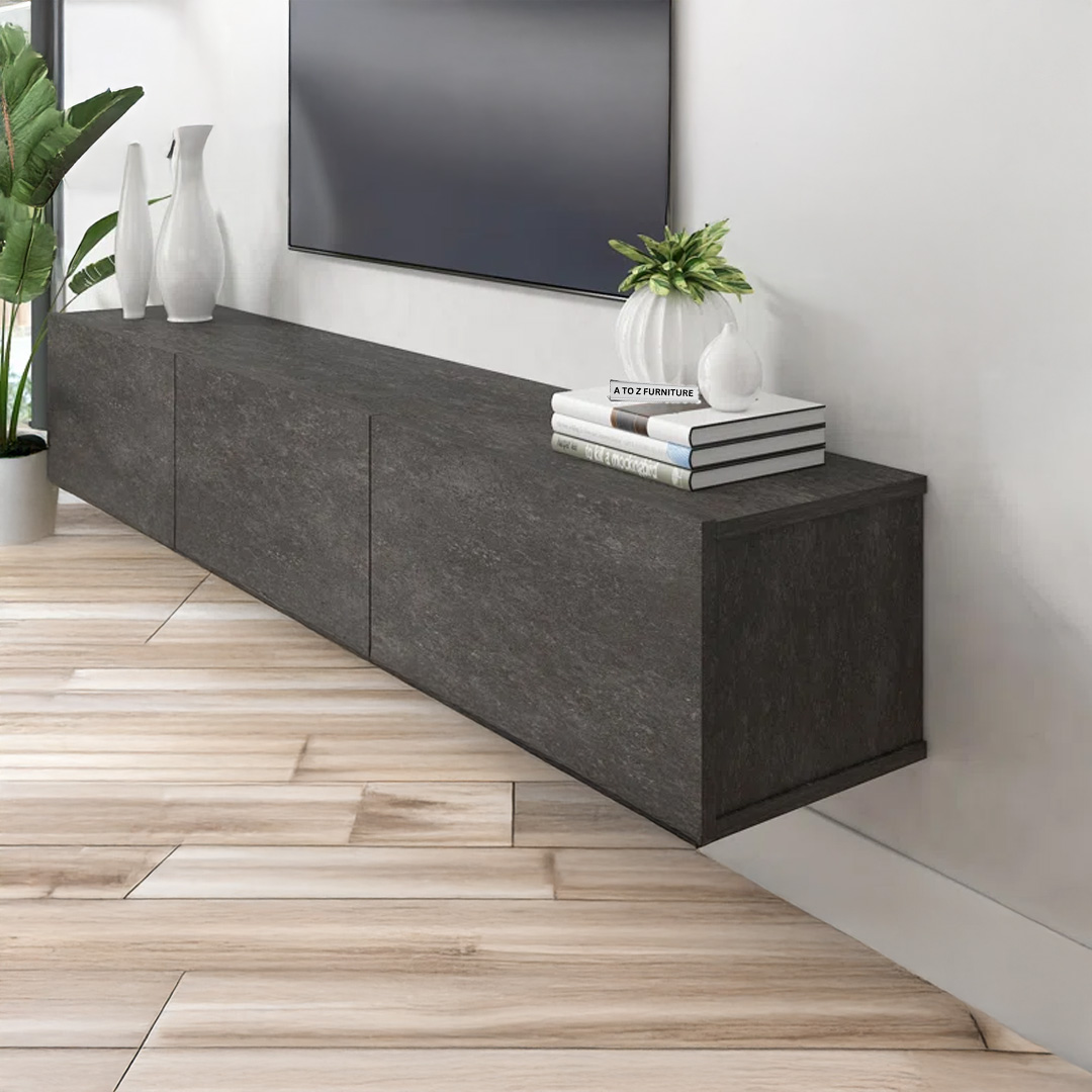 Elevate your entertainment area with the UrbanEdge Wall-Mount TV Unit, exclusively by A to Z Furniture. With its sleek, contemporary design and rustic grey concrete finish, this floating TV unit adds modern elegance to any living space. Designed to accommodate TVs up to 80 inches, it offers both aesthetic appeal and practical storage. The three drop-down cabinet doors open to reveal ample space for your media devices, accessories, or decorative items, keeping your space organized and clutter-free.
