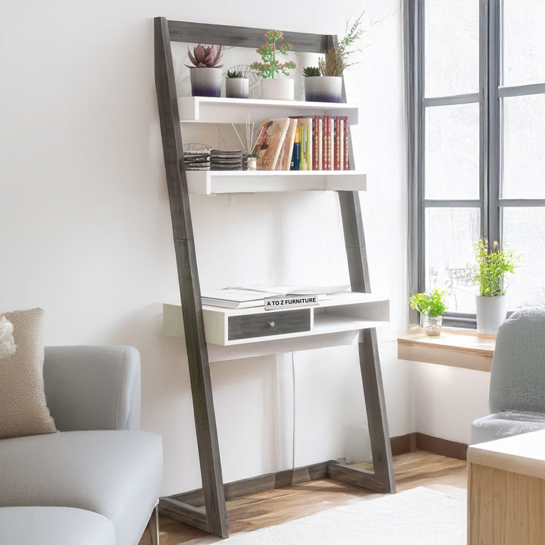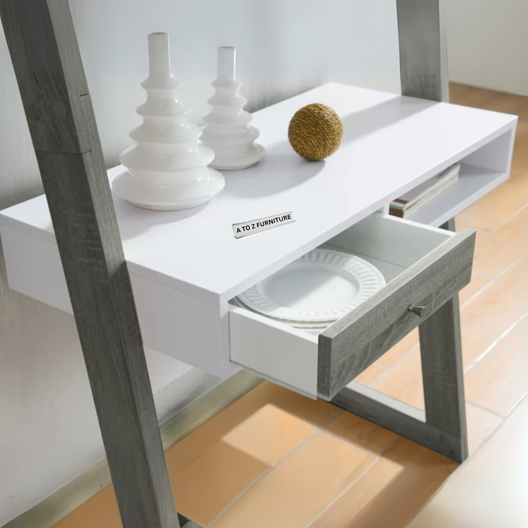 Elevate your home workspace with the Celestial Leaning Desk a harmonious blend of rustic charm and modern practicality. Featuring a sleek leaning ladder frame and two-tone solid mdf surfaces, this desk saves precious floor space while offering desktop, shelf, and drawer storage. Its clean sled base and angled supports provide stability and style, making it ideal for UAE homes, student rooms, or compact offices. Equipped with built-in cable management and ready-to-assemble delivery, it's the perfect space-saving star for modern living.