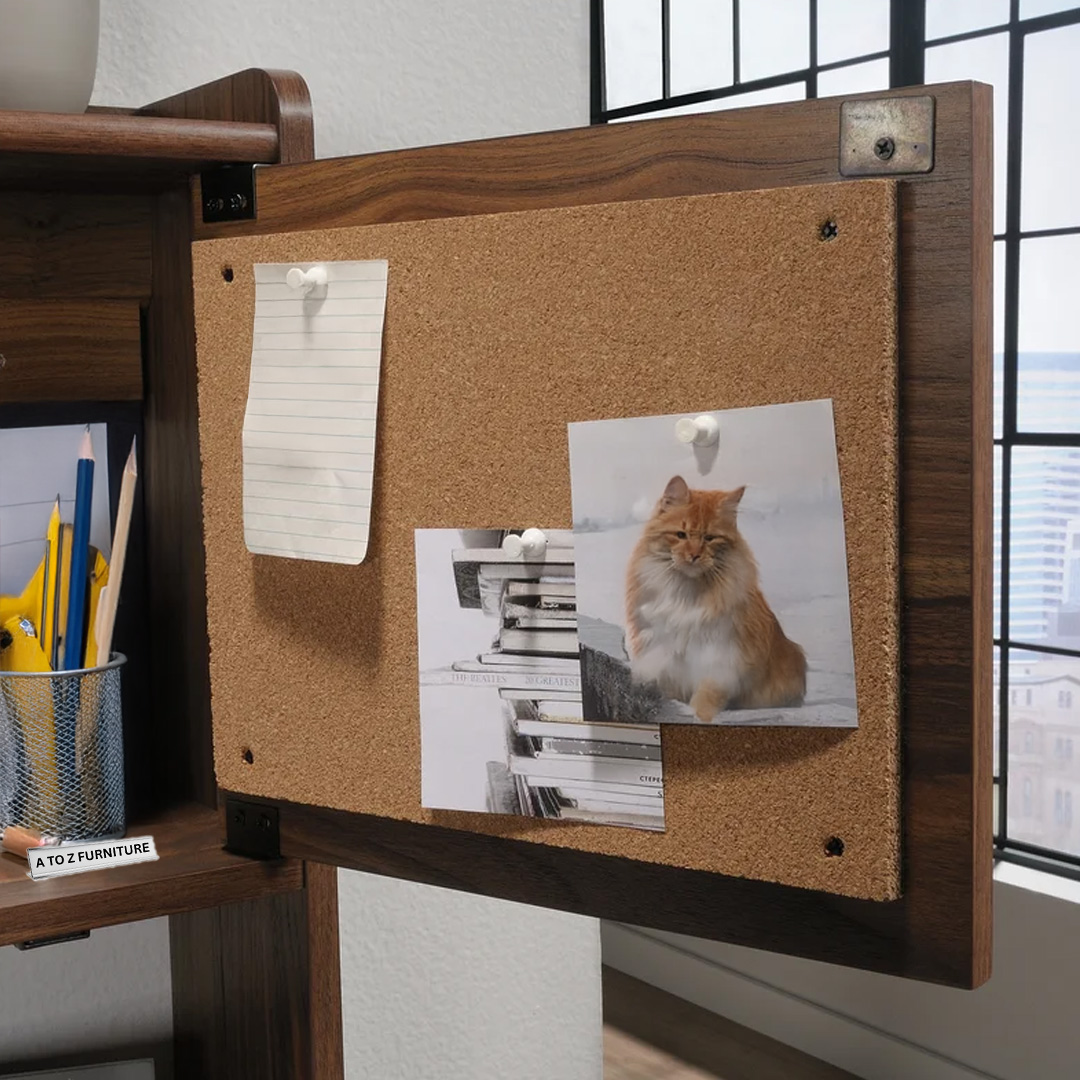 - Inside: built-in cork tack board and small storage cubbies