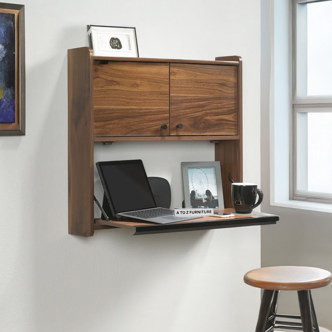 - Design: Wall-mounted, fold-down desktop supported by metal stay arms