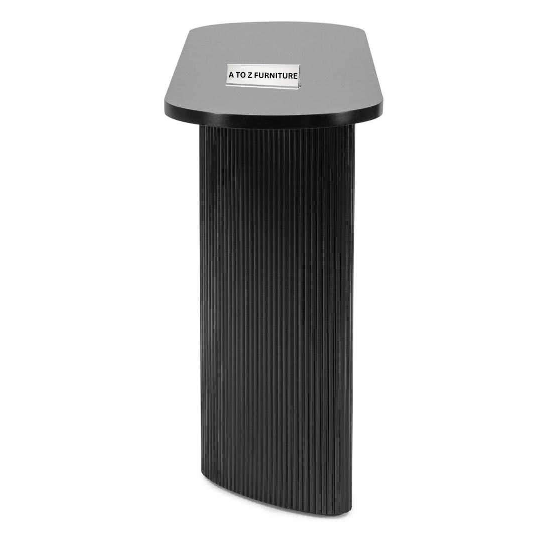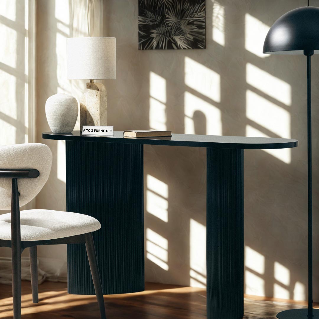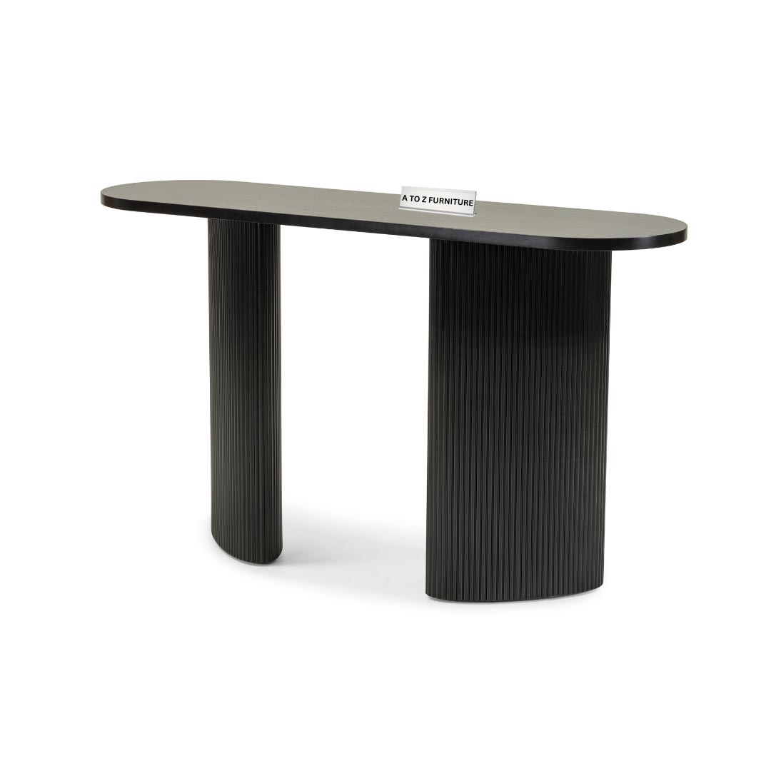 Elevate your space with the Paulina Console & Writing Desk a striking fusion of sculptural form and refined minimalism. Featuring a clean oval tabletop supported by twin ribbed cylindrical bases, this piece makes a bold statement in any hallway, living area, or office setting. Finished in crisp black with vertically fluted detailing, it captures both softness and architectural strength. Whether used as a decorative console or a compact writing desk, Paulina delivers sophistication with a functional edge.