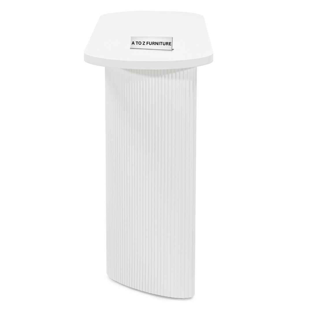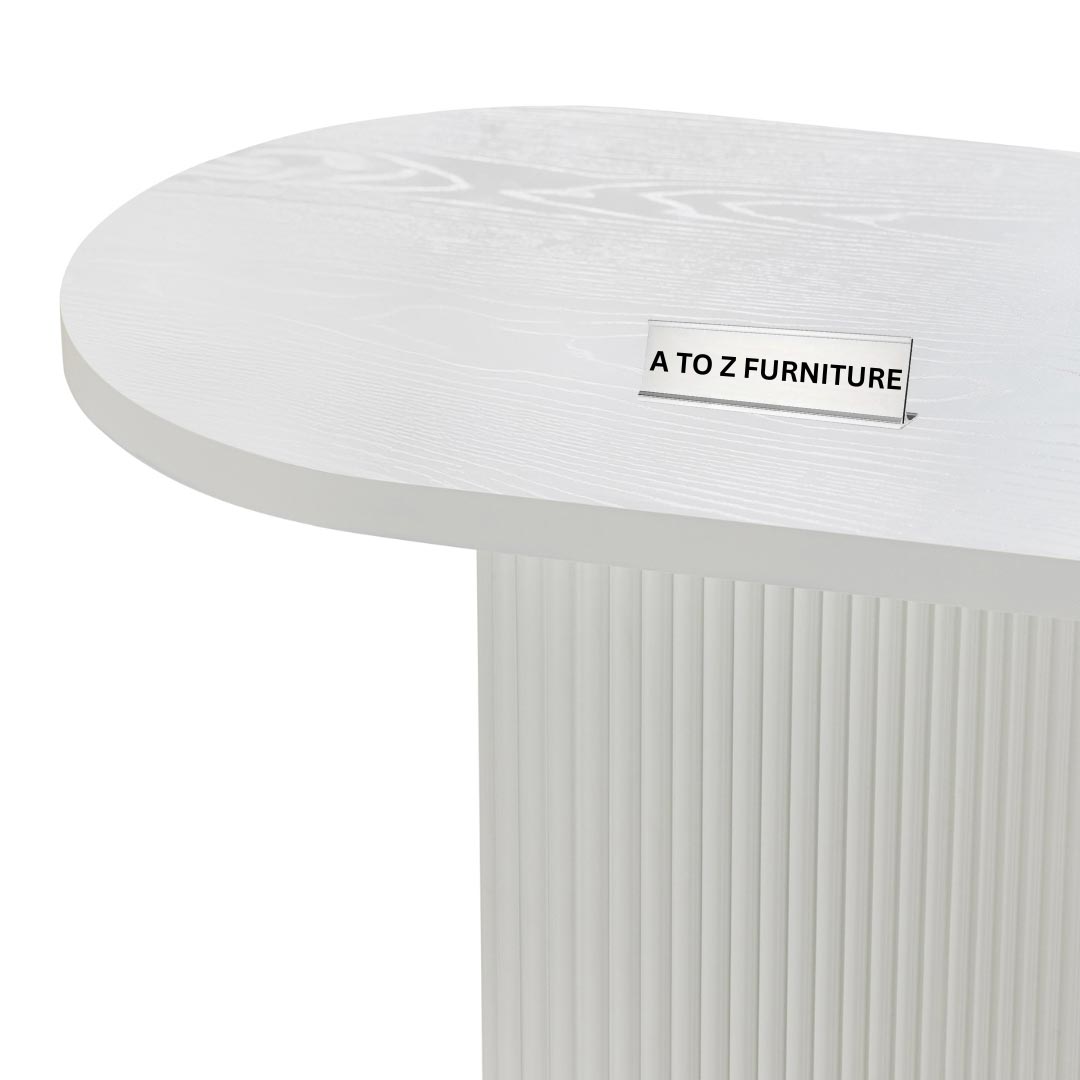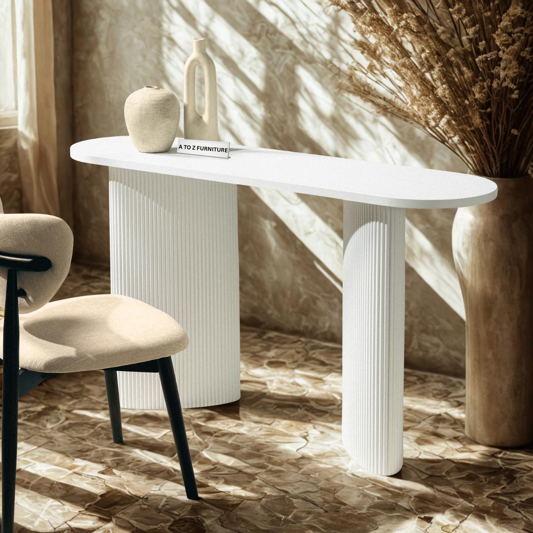 Elevate your space with the Paulina Console & Writing Desk a striking fusion of sculptural form and refined minimalism. Featuring a clean oval tabletop supported by twin ribbed cylindrical bases, this piece makes a bold statement in any hallway, living area, or office setting. Finished in crisp white with vertically fluted detailing, it captures both softness and architectural strength. Whether used as a decorative console or a compact writing desk, Paulina delivers sophistication with a functional edge.